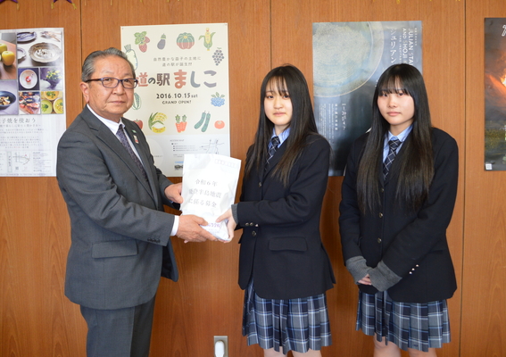 益子芳星高校生徒会福祉委員会の大森愛桜さん、牧野花音さんが町長室に能登半島地震の義援金を届けてくれました。