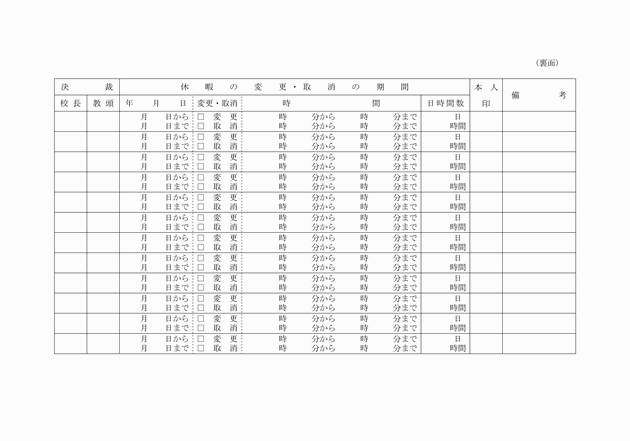 第19条 職員は、研修をしようとするときは、様式第8号による研修許可願を、校長に提出しなければならない。ただし、校長の2日を超える場合及びその他の職員の7日を超える場合にあっては、教育長に提出しなければならない。