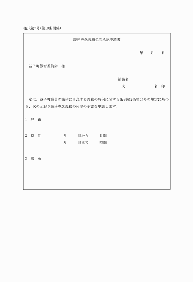 第18条 職員は、益子町職員の職務に専念する義務の特例に関する条例(昭和29年条例第6号)第2条に規定する職務に専念する義務の免除について承認を受けようとするときは、様式第6号による職務専念義務免除承認簿を、校長に提出しなければならない。ただし、校長の2日を超える場合及びその他の職員の7日を超える場合にあっては、様式第7号による職務専念義務免除承認申請書を教育長に提出しなければならない。