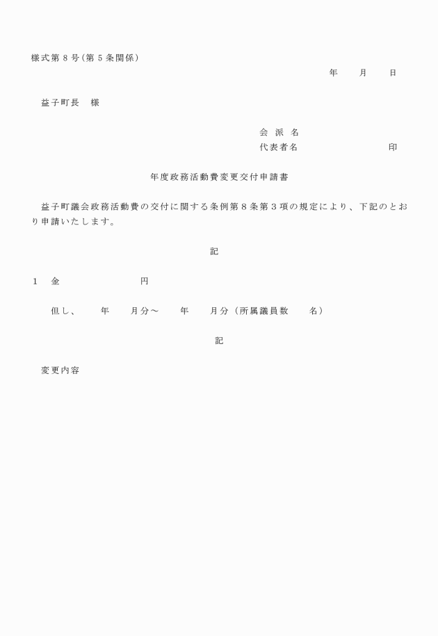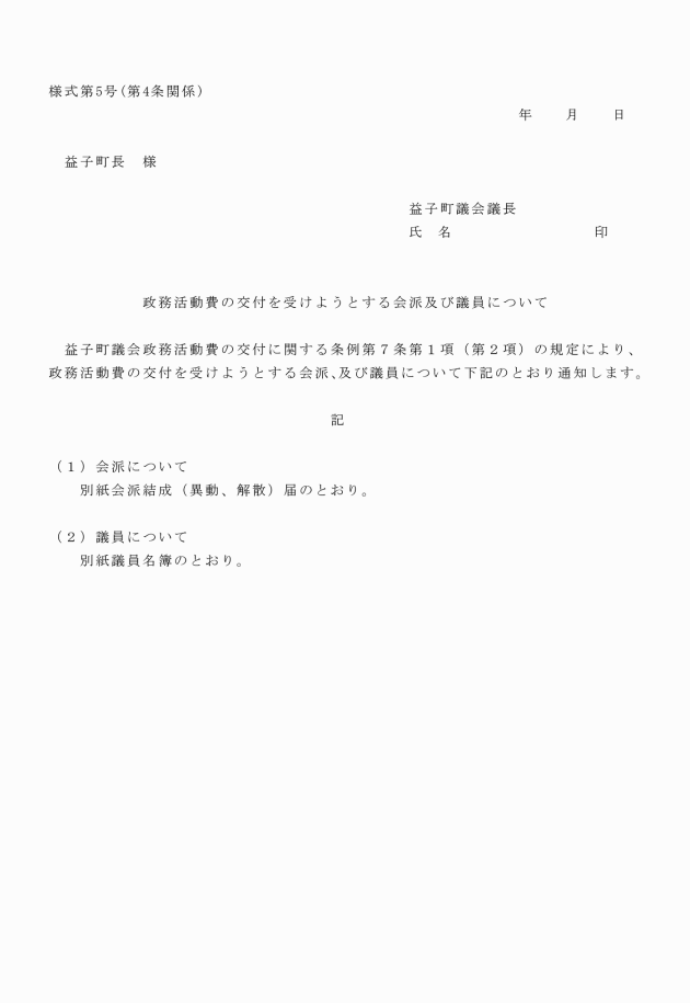 第8条 議長は、条例第11条第1項、第2項及び第3項の規定により提出された収支報告書の写しを、様式第14号により町長に送付するものとする。