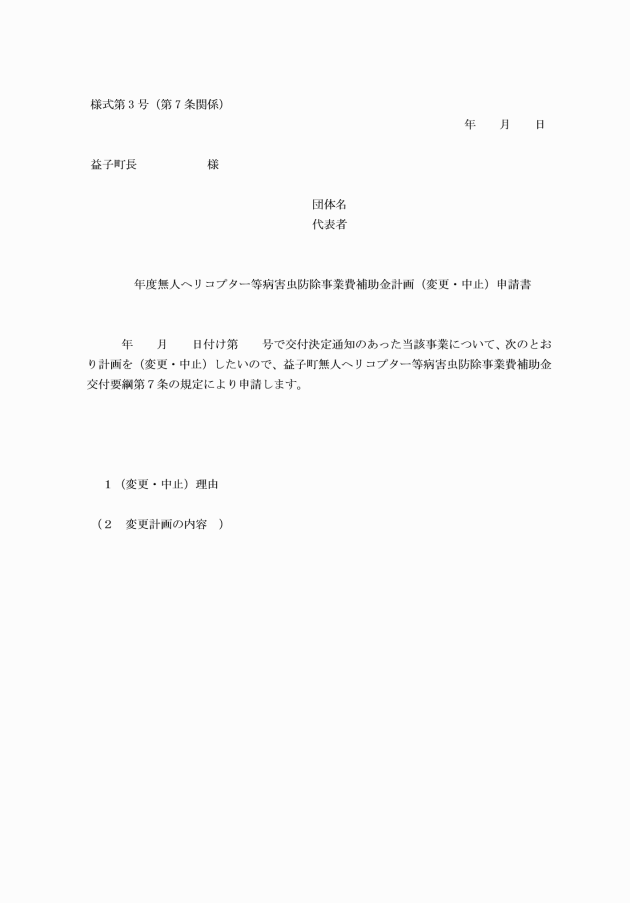 第7条 事業実施主体は、無人ヘリコプター等病害虫防除事業に要する経費の増減が生じたとき、又は事業の中止若しくは廃止をしようとするときは、無人ヘリコプター等病害虫防除事業費補助金計画変更申請書(様式第3号)を町長に提出し、承認を受けなければならない。